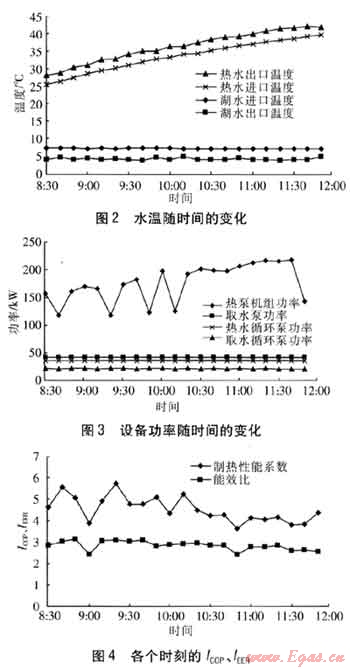 測試時間為2011年1月12日至14日,每天8:30—11:50,測試時間間隔為10min,確定系統(tǒng)運行基本穩(wěn)定后進行測試。測試數(shù)據(jù)包括:熱泵機組功率、熱水循環(huán)泵功率、取水泵功率、取水循環(huán)泵功率、熱泵機組熱水進出口溫度和流量、熱泵機組湖水進出口溫度和流量。取水系統(tǒng)原設(shè)計采用變頻控制,但測試時變頻器未最終調(diào)試完成,因此取水系統(tǒng)采用定流量運行。熱水循環(huán)系統(tǒng)也采用定流量運行。