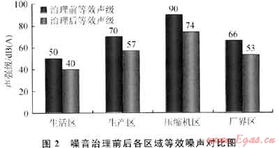 從圖2可以看出,X站壓縮機(jī)所產(chǎn)生的噪聲值經(jīng)治理后明顯降低,其中廠界區(qū)和生活區(qū)的噪聲值都在55dB(A)以下,達(dá)到了國(guó)家3類(lèi)聲環(huán)境功能區(qū)的夜間排放標(biāo)準(zhǔn)。