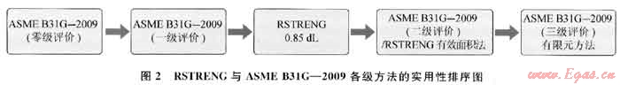 1) 新版ASME B31G—2009采用的分級評價方法便于評價人員根據(jù)現(xiàn)場操作難易程度、資料詳細程度以及評價精度等要求選擇不同的評價等級進行操作。大大提高了工作效率和評價結果的精確度,具有很強的實用價值。