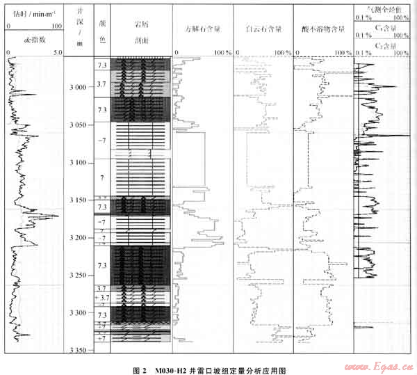 針對碳酸鹽巖地層,顯微識別定量分析巖性存在困難,應(yīng)用碳酸鹽巖定量分析技術(shù),對M030-H2井進行分析,在2961~3046m、3148~3164m、3208~3308m儲層段,顯示方解石含量低,白云石含量高,對應(yīng)綜合錄井參數(shù)為低鉆時,高氣測值段。證實碳酸鹽巖定量分析獲得的方解石、白云石、酸不溶物含量與巖屑剖面、鉆時、氣測等資料對比吻合性較好,快速識別出白云巖儲層(圖2)。