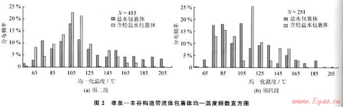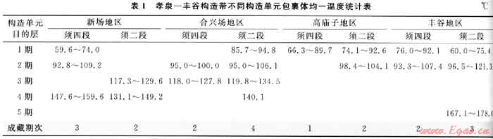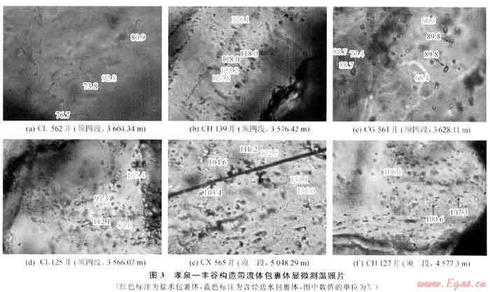 與烴類流體包裹體同幕的鹽水流體包裹體均一溫度不僅可以用來(lái)作為古溫度的近似值和熱事件的標(biāo)志,而且還可以用作油氣成藏幕次劃分的有效依據(jù)。