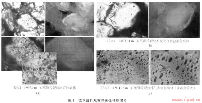 主要由大量發(fā)弱白色、淡黃色熒光的純氣烴相包裹體和不發(fā)熒光氣包裹體組成(圖1-c),幾乎賦存在所有的儲(chǔ)層內(nèi)。氣態(tài)烴包裹體一般成群成帶分布,與含烴的鹽水包裹體共存,包裹體氣液比一般小于8%,形狀比較規(guī)則,大小介于(8~1O)mm×(10~15)mm,鹽度均值為10.59%。