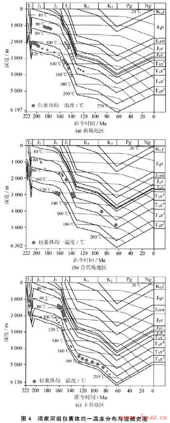 從單井包裹體均一溫度和埋藏史分析結(jié)果可以看出,孝泉-豐谷構(gòu)造帶大致存在2期成藏,早期為液態(tài)烴充注,晚期為天然氣充注,液態(tài)烴須二段成藏期為T(mén)3x5-J1,須四段成藏期為J1-J2早期。氣態(tài)烴成藏時(shí)間較晚,不同地區(qū)不同層段油氣充注的時(shí)間不盡相同。新場(chǎng)地區(qū)須四段主要成藏期從J3開(kāi)始成藏,持續(xù)至K1中期,須二段成藏期為J2中期-K1早期(圖4-a);合興場(chǎng)地區(qū)(包括高廟子地區(qū))須四段主成藏期為J2末期-K1早期,須二段成藏期為J2中晚期(圖4-b);豐谷地區(qū)須四段主要成藏期為J2末期-J3中期,須二段成藏期為J2中期-K期均有連續(xù)充注(圖4-c)。