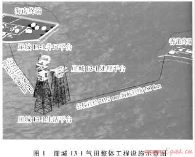 崖城13-1氣田大部分天然氣經(jīng)脫水和烴露點(diǎn)處理后,經(jīng)一條公稱直徑711.2mm長(zhǎng)780km的海底管線輸送到香港特別行政區(qū)用于發(fā)電,小部分天然氣和全部凝析油經(jīng)一條公稱直徑356mm長(zhǎng)90km的海底管線送往海南省南山終端處理和銷售。