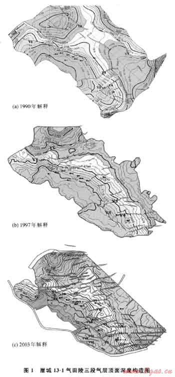 表1是1990年、1997年和2003年解釋的陵三段氣層頂(T62)、底(T70)構(gòu)造要素對比表。這幾次解釋的構(gòu)造走向均為北西 南東向(圖1),然而解釋的氣層頂面構(gòu)造圈閉面積、構(gòu)造幅度和最低圈閉線均有一定程度的變化,但在BP01資料基礎上研究得到的構(gòu)造圖在實鉆井深度、橫向壓力變化和氣水界面等方面均與實際資料最為吻合。