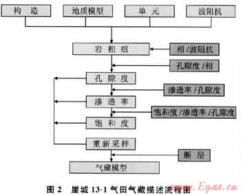 這次氣藏描述通過使用多步驟、復合地質(zhì)統(tǒng)計模擬技術,構(gòu)建了多個具有同等概率分布的巖相組、孔隙度和滲透率模型,圖2是崖城13-1氣田氣藏描述流程。巖相組模式是這個流程的基本模型,它是以巖心的巖相描述資料為基礎,用三維地震波阻抗體進行外推,應用分類變量條件序貫指示模擬方法(SISIMPDFP)來構(gòu)建的,模擬的實現(xiàn)與實際的鉆井資料和地質(zhì)模型保持一致。在這個模型的基礎上,選擇巖相組模型和特定巖相組的孔隙度統(tǒng)計結(jié)果,使用序貫高斯模擬方法(SGSIM)估算孔隙度值。滲透率的分布則根據(jù)不同的巖相組、孔隙度以及用井資料確立的孔-滲關系,利用序貫高斯協(xié)模擬(SGCOSIM)來確定。