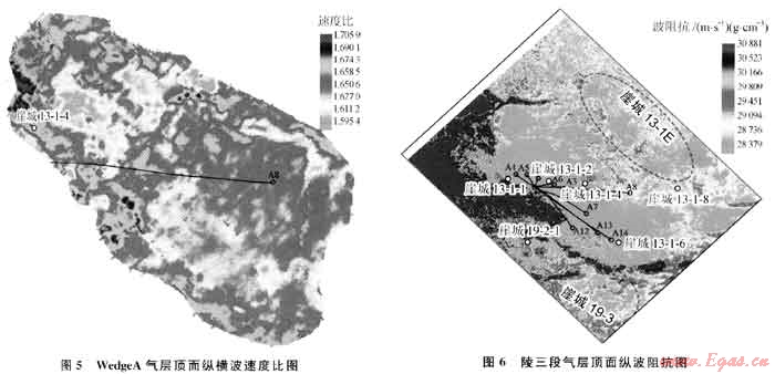 理論計算、正演模擬和實際道集分析均表明崖城13-1氣田陵三段氣層具有Ⅳ類AV0特征,那么三亞組和陵三段氣層周邊的勘探目標是否也屬Ⅳ類AVO特征呢?三亞組的WedgeA砂體在2000年之前只有崖城13-1-4井鉆遇,鉆遇的地層厚度為111.3m,但氣層厚度只有6m,且物性較差,滲透率只有14mD,之前的地質(zhì)研究成果認為該砂體的開發(fā)潛力不大。但是該砂體在地震資料上反射特征清楚,通過對比追蹤、AV0分析和疊前AV0反演認為該砂體具有與陵三段氣層相同的Ⅳ類AVO特征(圖4),從反演得到的WedgeA頂面縱橫波速度比分布圖(圖5)可以看出崖城13-1-4井鉆遇了WedgeA砂體的邊部,相對整個砂體來說崖城13-1-4井位置物性較差,而該砂體東部物性變好、含氣性特征更明顯、厚度也變大,通過崖城13-1-4井層速度預測砂體A8井處氣層厚度在50m以上,基于上述的地震預測結(jié)果決定鉆探A8井。于2000年在崖城13-1-4井東邊鉆探了A8井,在該砂體鉆遇氣層厚度達65.2m,滲透率高達1600mD、日產(chǎn)氣150×104m3,是目前該氣田產(chǎn)量最高的井之一,從而證實了鉆前的地震預測結(jié)果。