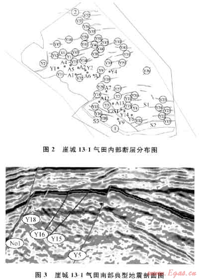 氣田內(nèi)部發(fā)育著兩組斷裂(圖2):一組為北西向和近南北向的斷裂,另一組NEE向的斷裂將崖城13-1氣田分成南、北兩塊,其中南塊又可分為S1、S2及S3塊;氣田內(nèi)部斷層的斷距較小,一般都小于70m(圖3),未完全錯斷陵三段近200m厚的儲集層,似乎對油氣不起封堵作用。