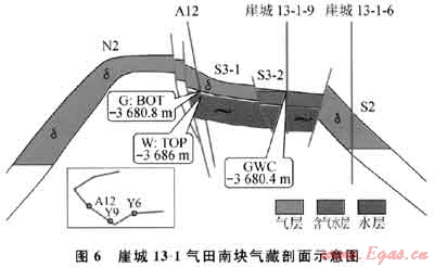 由于陵三段儲層厚,氣柱高度大,一直被認(rèn)為是具統(tǒng)一氣水邊界的均一氣藏。但氣田范圍內(nèi)發(fā)育許多斷層,因斷距較小,斷層的封堵性常未引起重視。隨著十幾年的持續(xù)開發(fā),氣田的動靜儲量差別較大。在構(gòu)造南塊S3-1高部位的A12井,竟然在主力氣層出現(xiàn)水層,其氣水界面高出“統(tǒng)一”氣水界面276m,令所有研究者十分困惑。通過對該井壓力資料進行分析,A12井區(qū)北側(cè)斷層Y3隨著生產(chǎn)壓力下降而開啟,開井時地層壓力系數(shù)只有0.7。為進一步挖掘與S3-1相鄰的S3-2的儲量,又鉆了Y9井,結(jié)果更令人費解,只鉆遇薄氣層及厚水層,與S3-2東側(cè)低部位的Y6井矛盾,因為Y6井無水層。經(jīng)小層對比,儲層橫向變化不大且斷層并不能斷開儲層段。