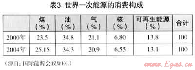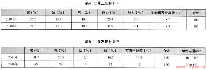 (1) 世界一次能源的消費構(gòu)成、世界工業(yè)用能構(gòu)成和世界發(fā)電用能構(gòu)成可見表3、表4、表5