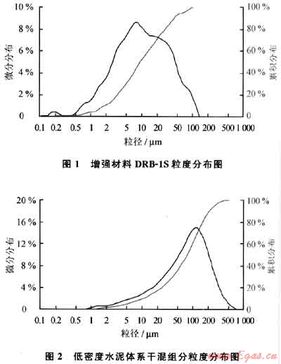 選定漂珠為減輕劑后,由于水泥的粒徑主要集中在20~30μm,漂珠粒徑集中于80~100μm,據(jù)固體懸浮模型,相鄰充填細(xì)微膠凝材料的尺寸dm50應(yīng)在被充填材料顆粒尺寸dm50的1/2.5~1/10范圍內(nèi)(dm50為顆粒累計(jì)體積分?jǐn)?shù)為50%處的顆粒直徑)。以固體懸浮模型為指導(dǎo),開(kāi)發(fā)了增強(qiáng)材料DRB-1S。DRB-1S由具有火山灰性質(zhì)的多種礦物微粉復(fù)配組成,在水泥漿中起到填充作用、級(jí)配調(diào)節(jié)作用和晶核作用[8~10]。