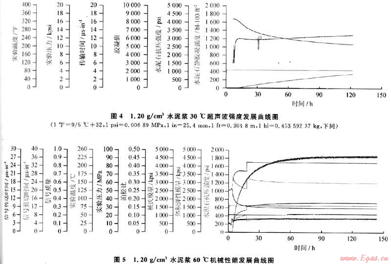 用5265型靜膠凝強(qiáng)度測(cè)試儀和6265型機(jī)械性能測(cè)試儀進(jìn)行了水泥漿強(qiáng)度發(fā)展和機(jī)械性能測(cè)試;圖4與圖5分別是1.20g/cm3密度水泥漿在30℃下的強(qiáng)度發(fā)展曲線和60℃下的機(jī)械性能發(fā)展曲線。