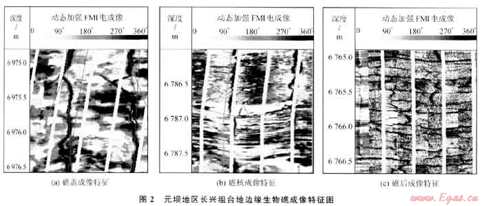 研究區(qū)大部分井都已取全取準了成像測井資料,利用成像測井對元壩地區(qū)長興組礁灘相儲層的沉積微相做進一步刻畫顯得尤為重要。通過對本區(qū)鉆井的成像測井信息與沉積微相的地質(zhì)信息進行對比分析表明,礁蓋、礁核是最有利于元壩長興組礁灘相優(yōu)質(zhì)儲層發(fā)育的沉積微相。