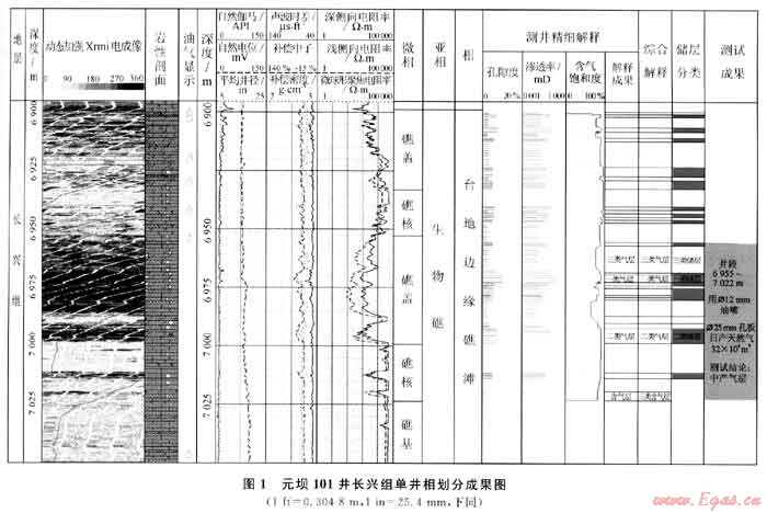 在區(qū)域地質(zhì)背景分析的基礎上,綜合利用成像測井、常規(guī)測井及巖屑薄片鑒定等資料,結(jié)合實際鉆探成果進行了研究區(qū)長興組的單井相劃分。以元壩101井單井相劃分為例(圖1),圖中顯示該段地層自然伽馬低值,約10API,巖性純,以淺灰色白云巖、溶孔白云巖及生屑灰?guī)r為主,夾有云質(zhì)灰?guī)r和含云灰?guī)r;成像圖像上可見6900~6925m和6950~7000m裂縫及溶蝕孔洞非常發(fā)育,對應的孔隙度曲線明顯增大,儲集物性好,電阻率曲線較致密圍巖明顯降低,呈大幅度正差異特征,儲層滲透性好。這些特征反映當時的沉積水體相對較淺,沉積水體能量較強,白云巖化作用較強,易形成溶蝕孔洞白云巖儲層,為臺地邊緣生物礁儲層沉積特征。取心資料顯示,該井段含有大量生物碎屑,這些生屑多為有孔蟲類、腕足類及鰱的化石,而這些生物正是區(qū)域上長興組沉積時期生物礁的附礁生物[2];結(jié)合研究區(qū)所有單井的長興組沉積相分析結(jié)果,綜合認為該地層屬于臺地邊緣礁灘相沉積。