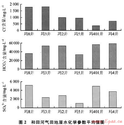 統(tǒng)計(jì)分析結(jié)果表明,井間地層水的化學(xué)特征也存在較大的差異(圖2)。地層水在西部的瑪8、瑪3井明顯富含HC03-,可能與西部保存條件相對(duì)較差有關(guān)。東部的瑪4等井HC03-的含量明顯偏低。Cl-、S042-含量等參數(shù)在井間變化大,無規(guī)律性,說明井間的地層水連通性差,不是統(tǒng)一的連通底水。在同一口井縱向上水性也有差異,而且沒有明顯的變化趨勢(shì),瑪8井古潛山頂面HC03-含量較高,Cl-濃度低,其他參數(shù)縱向上也有變化?,?井地層水各項(xiàng)參數(shù)隨深度變化也有差異,可能預(yù)示縱向上不同儲(chǔ)層段連通性差,不同層段地層水有分隔。總體而言,該區(qū)地層水的Cl-、HC03-、S042-含量等參數(shù)在平面上與縱向上都有較大的變化,沒有統(tǒng)一的塊狀底水。