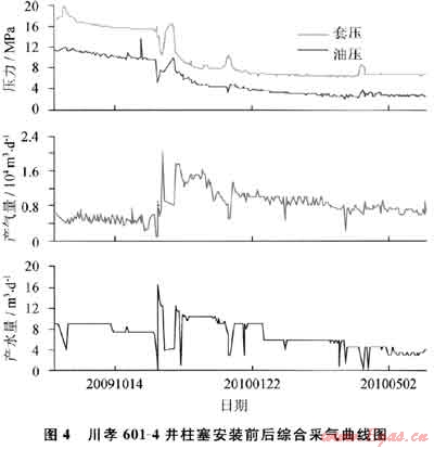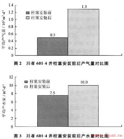 川孝601-4井施工前產(chǎn)氣0.5×104m3/d,產(chǎn)水7.5m3/d;施工后產(chǎn)氣1.3×104m3/d,產(chǎn)水10m3/d,增產(chǎn)天然氣0.8×104m3/d,排水采氣效果顯著。綜合采氣曲線可以看出:該井自安裝柱塞氣舉以來,油套壓差減小,產(chǎn)氣量顯著增加,排水采氣效果明顯。柱塞氣舉安裝前后產(chǎn)量對比如圖2、3所示,柱塞安裝前后綜合采氣曲線如圖4所示。