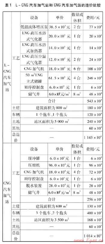 L-CNG汽車加氣站和CNG汽車加氣站的造價比較見表1。