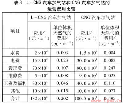 L-CNG汽車加氣站與CNG汽車加氣站的運(yùn)營費(fèi)用比較見表3。