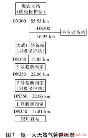 石嘴山市天然氣工程管道(簡稱銀-大天然氣管道)起點為銀川的銀川首站,在大武口區(qū)和平羅縣分別設(shè)分輸站,末站設(shè)在惠農(nóng)區(qū)的煤氣廠。該管道全長150.23km,管道規(guī)格分別為DN 350、300、200mm,設(shè)計年輸氣能力為6×108m3/a。該管道距離較長,采用強制電流陰極保護。銀-大天然氣工程管道概況見圖1。