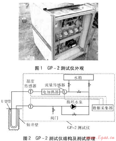 目前的測試裝置均是以擾動-響應(yīng)的方式來推算地下的換熱情況和巖土體熱物性參數(shù)。本次試驗的測試裝置是中國地質(zhì)大學(xué)(武漢)工程學(xué)院研制的GP系列測試儀(GP-2),測試儀外觀見圖1,測試儀結(jié)構(gòu)及測試原理見圖2。GP-2測試儀的測試原理:在鉆孔中埋設(shè)U型管并回填[4],使U型管與測試儀管路連接,形成一個閉合回路。在循環(huán)水泵的作用下,水通過電加熱器加熱升溫后進(jìn)入U型管,將熱量傳遞給周圍的巖土體,最后流回到測試儀中。通過測試,獲得U型管的進(jìn)、出水溫度和流量,用以計算巖土體的熱物性參數(shù)。