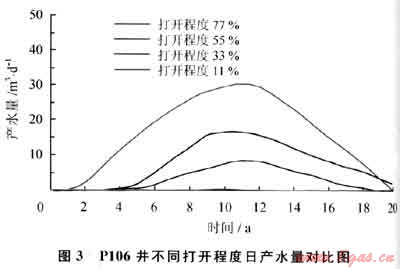 數(shù)值模擬研究結(jié)果表明:當(dāng)打開11%時(shí),由于氣層上部位置主要為Ⅲ類儲(chǔ)層,物性差,氣井生產(chǎn)基本不見(jiàn)水,但穩(wěn)產(chǎn)期不足3a。當(dāng)打開33%、55%、77%時(shí),見(jiàn)水時(shí)間分別為5.2a、3.5a、1.4a,無(wú)水期采出程度分別為15.1%、8.8%、6.2%;當(dāng)打開程度大于77%時(shí),由于氣層中、下部位置多為Ⅱ類儲(chǔ)層,且局部發(fā)育裂縫,儲(chǔ)層物性較好,開發(fā)過(guò)程中邊水將快速推進(jìn)。可見(jiàn),隨著P106井氣層打開程度的不斷增加,無(wú)水采氣期將逐漸縮短,相應(yīng)的無(wú)水期采出程度將逐步降低,而穩(wěn)產(chǎn)期因多因素影響將發(fā)生由低到高然后降低的變化。由此認(rèn)為,P106井氣層自上而下打開程度控制在55%左右為最優(yōu)[6](圖3)。