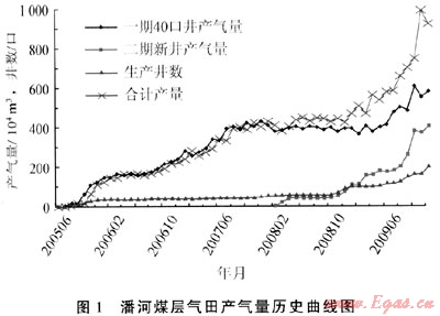 隨著生產(chǎn)井的井?dāng)?shù)的增加和生產(chǎn)天數(shù)的增長,儲層壓降漏斗不斷擴大,產(chǎn)氣量發(fā)生持續(xù)不斷地上升。如圖1所示,先導(dǎo)性試驗井從2005年5月開始陸續(xù)投產(chǎn),到當(dāng)年底40口井全部投產(chǎn),產(chǎn)量處于上升過程;之后井?dāng)?shù)沒有增加,通過不斷調(diào)整工作制度,摸索煤層氣排采規(guī)律,持續(xù)了2年的產(chǎn)量上升期。從2007年8月到2009年4月,保持一個穩(wěn)定生產(chǎn)階段。2008年2月二期新井開始投產(chǎn),到2009年新井的投產(chǎn)和更大范圍的排水降壓,對前期先導(dǎo)性試驗井產(chǎn)生明顯的影響,單井產(chǎn)量和總產(chǎn)量又躍上一個新的臺階。