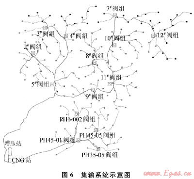 采用“分片集輸一級(jí)增壓”的集輸工藝,減少了中間場(chǎng)站增壓集輸環(huán)節(jié),優(yōu)化了集輸工藝,從而使采氣半徑大幅度增加,由相關(guān)規(guī)范上界定的“不宜大于5km”,增加到了17km,技術(shù)取得創(chuàng)新性重大突破,在相同規(guī)模氣田建設(shè)條件下,實(shí)現(xiàn)了由閥組代替集氣站,閥組與閥組之間的串聯(lián)枝狀布置,大大簡(jiǎn)化了集輸設(shè)施,從而大幅度降低項(xiàng)目投資。這種集輸工藝在煤層氣田建設(shè)中首次應(yīng)用,取得了巨大成功,已申報(bào)國(guó)家發(fā)明專利(圖6)。