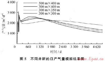 井間距是產(chǎn)量預(yù)測(cè)和經(jīng)濟(jì)評(píng)估的重要參數(shù),它決定著煤層氣開發(fā)的經(jīng)濟(jì)效益和煤層氣資源的回收率。井間距的大小取決于地質(zhì)條件、儲(chǔ)層性質(zhì)和生產(chǎn)規(guī)模對(duì)經(jīng)濟(jì)性的影響。為確定該區(qū)煤層氣開發(fā)合理的井網(wǎng)和井距,在儲(chǔ)層評(píng)價(jià)和歷史擬合的基礎(chǔ)上,利用先進(jìn)的儲(chǔ)層模擬軟件分別模擬了不同井間距的煤層氣產(chǎn)能(圖5)。針對(duì)不同井間距的布置,綜合應(yīng)考慮本區(qū)構(gòu)造裂隙和煤層主裂縫發(fā)育方向、煤層氣井產(chǎn)氣高峰期到達(dá)時(shí)間、氣井產(chǎn)能和煤層氣最終采收率等主要因素,對(duì)比分析并考慮經(jīng)濟(jì)評(píng)價(jià)的結(jié)果,在該地區(qū)采用300m×300m正方形井距布井最為經(jīng)濟(jì)合理,井網(wǎng)方位確定為N60°E方向和N30°W,在實(shí)際應(yīng)用中取得良好的效果,并在柿莊南、樊莊等地進(jìn)行推廣應(yīng)用。