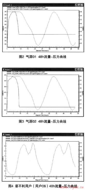 為保證至用戶11的最低壓力不低于3.5MPa,模擬過程中對流量調節(jié)閥的參數(shù)進行了設置,確保其閥前壓力不低于3.5MPa。各氣源點及最不利用戶(用戶06)的48h流量-壓力曲線如圖2、圖3、圖4所示。從模擬計算結果可以看出,在增加電廠用氣的情況下,2012年采用高壓管道儲氣調峰能夠滿足要求,管網最不利點用戶的最小運行壓力為1.86MPa。