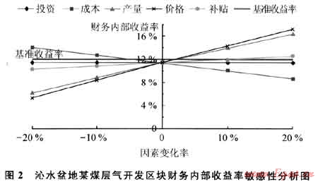 在計算期內(nèi),可能發(fā)生變化并影響項目盈利能力的主要因素有產(chǎn)量、投資、成本、產(chǎn)品銷售價格和補貼。根據(jù)沁水盆地某煤層氣區(qū)塊的各單項因素的變化對財務內(nèi)部收益率的影響進行了敏感性分析,敏感性分析結(jié)果見圖2。從敏感性分析結(jié)果可以看出,財務內(nèi)部收益率對投資、氣價和產(chǎn)量較為敏感,其次是成本、補貼。