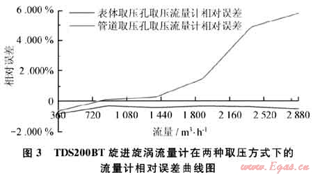 從以上數(shù)據(jù)表和曲線圖中可以看出:旋進旋渦流量計型號一定的情況下,用表體取壓孔取壓方式檢定流量計時流量計的線性度較好,用管道取壓孔取壓方式檢定流量計時流量計的線性度較差;流量測點相同的情況下,表體取壓孔取壓檢定方式的流量計誤差較小,管道取壓孔取壓檢定方式的流量計誤差較大;兩種取壓方式引起的誤差隨著流量的增大而逐漸增大,在流量為2900m3/h時兩者相差近6.2%,遠遠超出了流量計的準確度等級。所以,在旋進旋渦流量計的檢定過程中,應(yīng)避免在流量計表體取壓孔以外的地方取壓進行檢定。