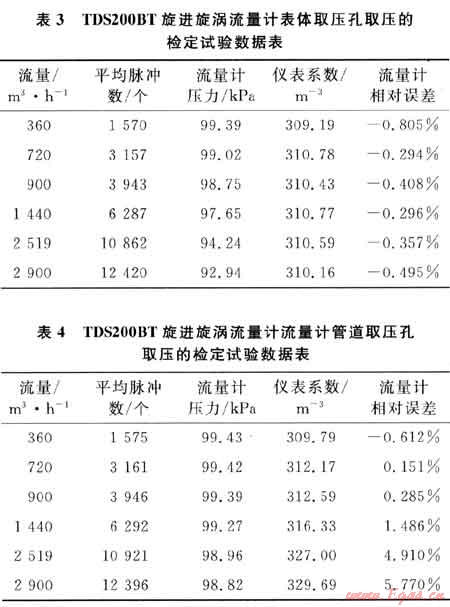 旋進旋渦流量計檢定過程中使用的取壓孔在表體的下部或側(cè)部。為了弄清楚取壓方式對流量計檢定準確度的影響,分別在流量計表體取壓孔取壓和管道取壓孔取壓兩種取壓方式下進行了流量計檢定試驗。