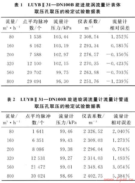以使用廣泛的LUYBⅡ31—DN1008旋進旋渦流量計為例,系統(tǒng)運行時間為60s,標準裝置的滯止平均溫度為28.9℃,空間平均濕度為30%,流量計的平均溫度為28.3℃,在表體取壓孔取壓和管道取壓孔取壓的流量計檢定試驗數(shù)據(jù)分別如表1、2所示。