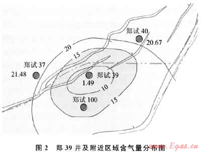 斷層(“陷落柱”)的作用一是對(duì)附近煤層氣有解吸作用,封堵性差可造成煤層含氣量低,但解吸范圍有限,例如鄭試39井位于斷裂帶內(nèi)(圖2),含氣量?jī)H2.5m3/t,主要由于斷層、“陷落柱”煤層氣很快逸散,造成含氣量低;二是近斷層地帶裂縫發(fā)育,通過壓裂易與斷層、地層水或地表水溝通,煤層氣沿裂縫逸散,排采井可能產(chǎn)水量大、產(chǎn)氣量較小或不產(chǎn)氣[5]。