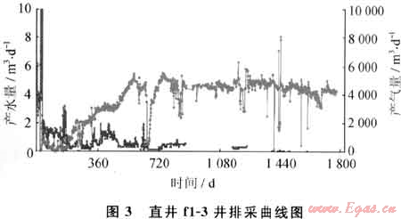 含氣性差異是產(chǎn)量相差較大的主要原因,在構(gòu)造溢散邊界(斷層、“陷落柱”)附近、地下水補(bǔ)給邊界附近,其煤層氣富集條件較差,開發(fā)效果較差。低產(chǎn)井區(qū)位于構(gòu)造溢散邊界,也是地下水補(bǔ)給邊界附近,煤層氣含量低,其富集較差。樊莊區(qū)塊東部井區(qū)煤層氣井處于大氣降水補(bǔ)給邊界,含氣量一般介于5~17m3/t,含氣飽和度低于80%,直井平均產(chǎn)量不足500m3/d。圖1為樊莊區(qū)塊東部1口井的排采曲線,該井排采2年多累計(jì)產(chǎn)氣量?jī)H25×104m3,最高日產(chǎn)氣量還達(dá)不到1000m3。該井區(qū)多數(shù)井生產(chǎn)情況與這口井相似,樊莊區(qū)塊東部井區(qū)單井產(chǎn)量普遍較低的主要原因是含氣量、含氣飽和度低,因此開發(fā)效果較西部差。