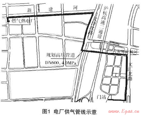由于城市門站直線距離電廠不足3km,管線距離僅4.5km,為此電廠所需天然氣從市門站接出,并用專線直供電廠??紤]到電廠二期擴建及減少啟停和事故狀態(tài)下對天然氣管網(wǎng)的沖擊,管徑選擇為DN600。但是目前的城市門站只能滿足電廠一期工程的需要,為此一期供氣工程利用現(xiàn)狀高壓系統(tǒng),在現(xiàn)狀進站總管設(shè)置三通后,經(jīng)計量(成撬設(shè)置)后直供電廠。同時與E游公司申請增加一路供應(yīng),配合電廠進行二期改造工程。擴容后的門站將不僅能滿足電廠擴建的需要而且也能滿足城市將來發(fā)展的需要。