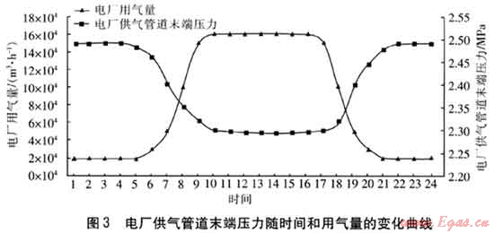 圖3的壓力變化曲線可以清楚地表明電廠運行的各時間段進氣管道末端壓力的變化,該壓力變化曲線圖為工程前期制定電廠供氣管道方案提供了重要的參考依據(jù)。