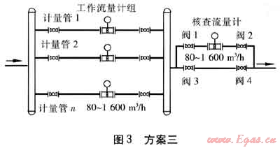 ③ 城市天然氣門站計量系統(tǒng)的設(shè)計方案還要充分考慮城市經(jīng)濟發(fā)展對天然氣供氣設(shè)備擴容的需求。如果選用渦輪流量計或超聲流量計作為工作流量計,則應(yīng)該考慮在圖3方案三的工作流量計組中預(yù)留擴展旁路。如果選用標(biāo)準(zhǔn)孔板流量計作為工作流量計,這種流量計在雷諾數(shù)符合要求的前提下,可以通過擴大開孔直徑、調(diào)整差壓上限等方法,在一定范圍內(nèi)解決擴容的問題。