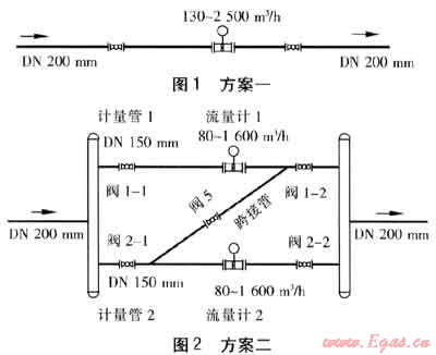 圖1、2為某城市天然氣門站計量系統(tǒng)工藝管路方案一和方案二。兩個方案相比較,方案一結(jié)構(gòu)簡單,工程造價較低,方案二則相反。但是,采用兩管并聯(lián)的方案二,可以使整個計量系統(tǒng)的測量范圍從130~2500m3/h(量程比20:1)擴展到80~3200m3/h(量程比40:1)。在門站運行過程中,如果遇到流量波動較大時,方案二可以隨時打開或關(guān)閉兩臺流量計中的一臺,使流量計量儀表始終工作在0.2qmax到0.8qmax這一計量性能最優(yōu)的范圍段(qmax為最大流量),從而保證整個計量系統(tǒng)的計量性能最優(yōu)。另外在流量計1或流量計2中的某一臺出現(xiàn)故障或進(jìn)行周期檢定時,可以使用單臺流量計供氣運行的方式,避免城市門站供氣中斷的情況發(fā)生。
