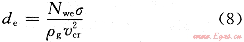 橢球體液滴韋伯?dāng)?shù)的臨界值為20~30。當(dāng)氣體流速大到足以使韋伯?dāng)?shù)達(dá)到臨界值時,速度壓力起主要作用,液滴就容易破壞。取韋伯?dāng)?shù)為Nwe=30回代到式(7),解出最大液滴的直徑(de),即
