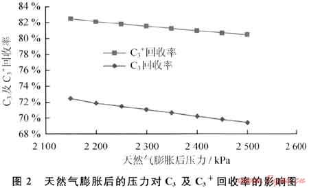 天然氣經(jīng)膨脹機(jī)組膨脹后的壓力對(duì)C3及C3+回收率的影響如圖2所示。