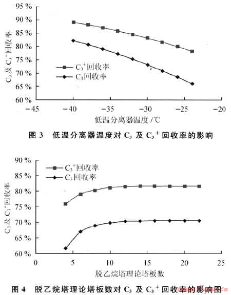 低溫分離器溫度對(duì)C3及C3+回收率的影響如圖3所示。由圖3可知,低溫分離器溫度越低,C3及C3+回收率就越高。回收率對(duì)低溫分離器溫度的敏感性較高[3],但低溫分離器溫度過(guò)低,制冷系統(tǒng)的負(fù)荷也將增加,同時(shí)因乙烷冷凝量的增加導(dǎo)致脫乙烷塔的處理負(fù)荷也會(huì)相應(yīng)增加。