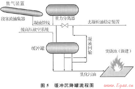 一、二級(jí)分離器排出的液體匯合后一起進(jìn)入緩沖沉降罐,經(jīng)緩沖沉降罐初步穩(wěn)定的油、水混合液輸往下游凝析油穩(wěn)定裝置的三相分離器進(jìn)行油、氣、水三相分離處理。