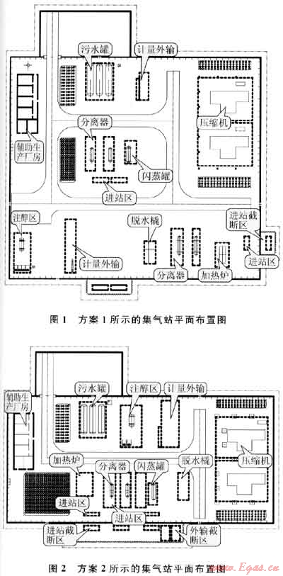 對比2個方案可以看出:方案1占地面積大,但上古生界氣藏氣井的集輸流程和上、下古生界氣藏合采氣井的集輸流程分開布置,便于管理;方案2占地面積小,設備布置較為緊湊。對于新建場站,推薦采用方案用效果還有待觀察。
