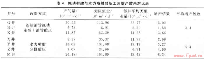 2010年采用連續(xù)油管拖動布酸+油管酸壓改造施工水平井3口,平均無阻流量是鄰井直井的3.4倍;而采用水力噴射分段酸壓改造施工水平井4口,平均無阻流量是鄰井直井的5.4倍,改造效果突出,其中2口井獲得日產(chǎn)百萬立方米的無阻流量(表4)。