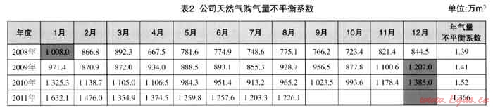 表2是我公司2008年以來4年的每個月份天然氣購氣量數(shù)據(jù)。其中:藍色是當年最高月份購氣量,黃色是當年最低月份購氣量,最后一列是“公司年度天然氣購氣量不平衡系數(shù)”。
