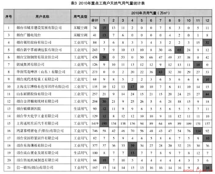 見表3“2010年重點工商戶天然氣用氣量統(tǒng)計表”。表中:藍色是年度最高月份用氣量,黃色是年度最低月份用氣量。工商戶最高月用氣量主要集中于1月份及12月份,這些月份正是公司供氣高峰時期。工商戶最低月用氣量主要集中于7、8月份,而這些月份正是公司供氣量較低的時間,上述兩個時間段直接決定了公司氣量不平衡系數(shù)的大小。多數(shù)工商戶在公司供氣高峰時也處于供氣高峰期,對公司總氣量不平衡的影響是負面的,我們稱之為負面影響氣量用戶。