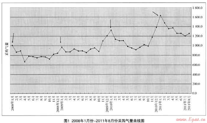 我公司天然氣購銷氣量在不斷增加的同時,氣量的波動程度即氣量的不平衡性也在不斷加大,為了分析問題,我們收集了2008年1月至2011年8月份的天然氣采購氣量及銷售氣量數(shù)據(jù),進行了專題分析研究,得出了一些結(jié)論,分析如下: