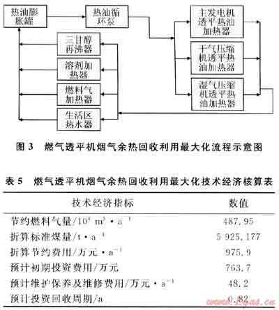 如果將這些熱源用戶全部改造成熱油換熱,并充分回收利用氣田上其他所有燃氣透平機得煙氣余熱,與本文2.3中涉及的熱油循環(huán)系統連成一體,那么將實現燃氣透平機煙氣余熱回收利用最大化,其流程如圖3所示。其相應的技術經濟核算見表5。這將會大量減少燃料氣的消耗量,提高能源的利用率,節(jié)約氣田開發(fā)生產成本,增加崖城氣田的經濟效益,應用前景廣闊。