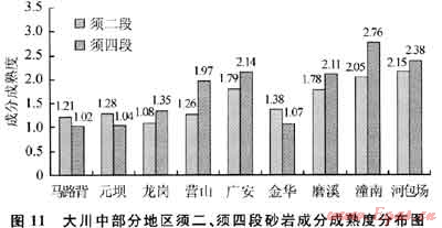 川中地區(qū)須家河組各砂層段厚度基本一致,砂巖百分比較高,一般介于70%~90%。經(jīng)巖礦鑒定,黏土雜基含量一般低于5%,淘洗干凈。除正粒序構(gòu)造砂層上部和逆粒序砂層底部可以有厚度不大的粉細粒巖屑砂巖外,主要為中粒、中粗粒巖屑石英砂巖或長石巖屑砂巖。巖屑多為硅質(zhì)巖屑、石英巖巖屑及花崗巖巖屑等硬質(zhì)巖屑,成分成熟度介于1.02~2.76(圖11)。在營山以北、河包場以東區(qū)域須四、須六段軟質(zhì)巖屑明顯增加、雜基含量增多,須二段除川北元壩、九龍山地區(qū)部分層段雜基含量較高及碳酸鹽巖巖屑增多外,普遍淘洗干凈,且在九龍山、元壩、馬路背及金華地區(qū)須二段“腰帶子”泥巖之下局部可見石英砂巖,表明須二段湖盆范圍較須四、須六段的范圍大,且局部有海侵影響。